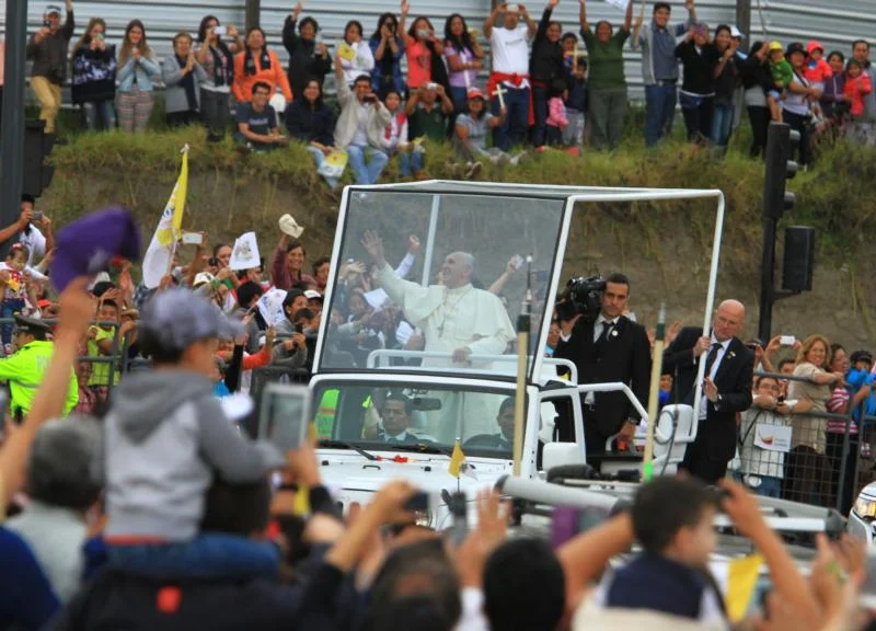 Pope Francis greets the crowd from his popemobile, a Jeep Wrangler, as he arrives in Quito, Ecuador, July 5. The pontiff will use the same model during his visit to the United States in September. (CNS photo/Robert Puglla, EPA)
