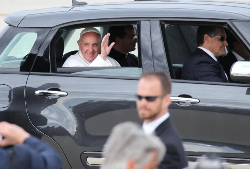 Pope Francis waves from a Fiat 500 L sedan as he leaves the airfield at Joint Base Andrews in Maryland Sept. 22. The Archdiocese of Philadelphia is auctioning off two of the same model cars used to shuttle Pope Francis around the Philadelphia area during his visit to the city last September. (CNS photo/Bob Roller)