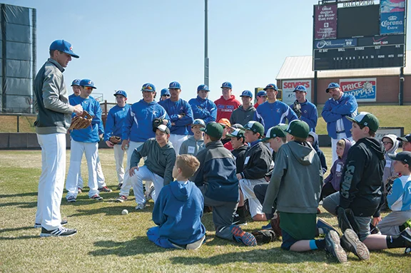 Roeland Park’s Bishop Miege head baseball coach Will Gorden (far left) leads a clinic for kids ages 7-14. The clinic was followed by games with St. James Academy, Lenexa, all to benefit a cancer foundation called Alex’s Lemonade Stand. Photo by Joe McSorley.