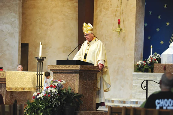 Archbishop Joseph F. Naumann drives home the importance of religious liberty and conscience rights during a Mass July 4 at Church of the Nativity in Leawood during this year’s Fortnight for Freedom.