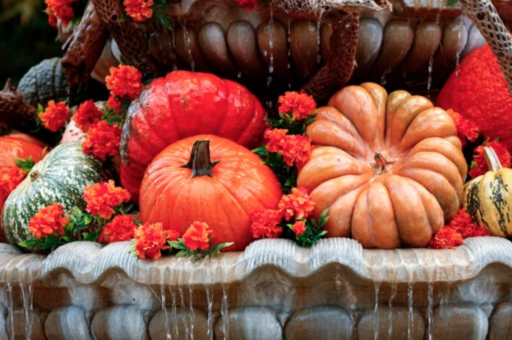 A bounty of fall pumpkins and flowers are displayed at the Tlaquepaque Arts and Crafts Village in Sedona, Ariz. The first Thanksgiving feast was marked in 1621 at Plymouth to celebrate a good harvest. Thanksgiving is celebrated Nov. 24 this year. (CNS photo/Nancy Wiechec)