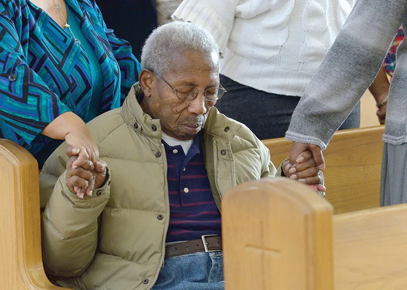 On his 100th birthday, Willie Hall attended Mass at his parish, Our Lady & St. Rose in Kansas City, Kansas, where he is surrounded in prayer by his daughter-in-law Paulette, left, and his daughter Marie. LEAVEN PHOTO BY JILL RAGAR ESFELD