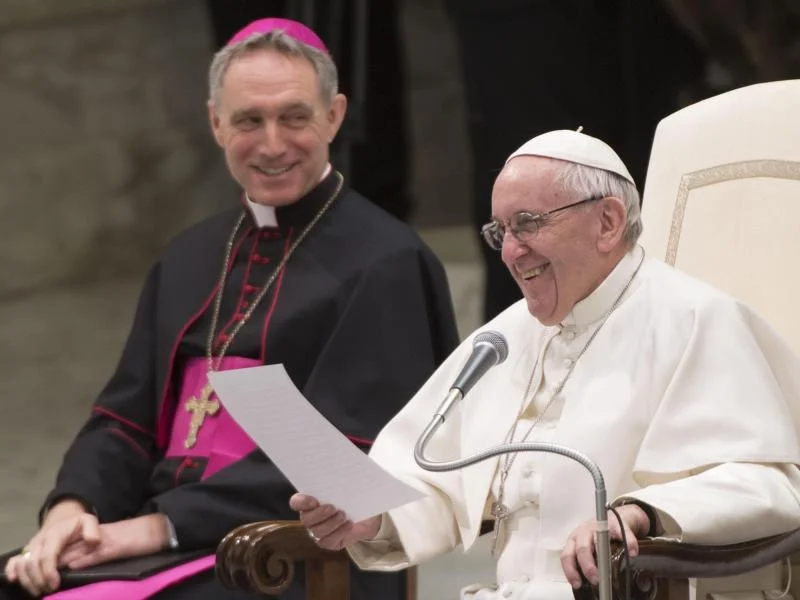 Pope Francis smiles during his general audience in Paul VI hall Feb. 15 at the Vatican. Also pictured is Archbishop Georg Ganswein, prefect of the papal household.(CNS photo/Claudio Peri, EPA)