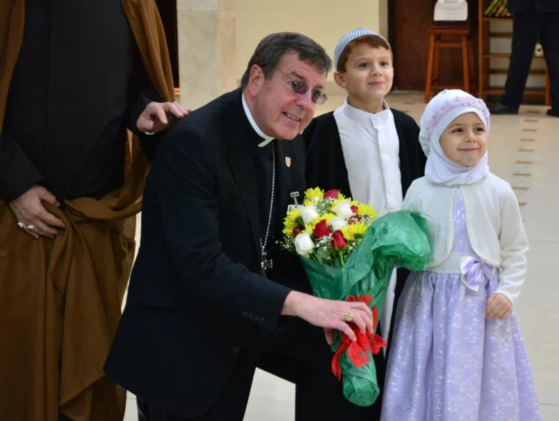 Detroit Archbishop Allen H. Vigneron poses for a photo with a young Muslim boy and girl during a "unity lunch" with local Muslim leaders at the Islamic House of Wisdom in Dearborn, Mich., April 5. (CNS photo/Mike Stechschulte, The Michigan Catholic)