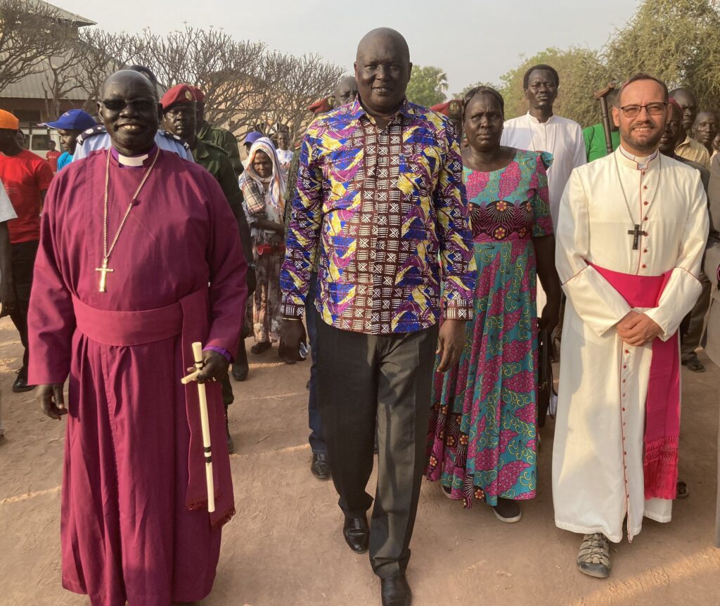 At the launch of the “Walking for Peace” pilgrimage, the bishop was joined by Anglican Bishop Alapayo Manyang Kuctiel of Rumbek; Rin Tueny, the governor of Lakes State; and Sister Orla Treacy, an award-winning Irish Loreto sister who has devoted her life to educating young women threatened by early and forced marriages.