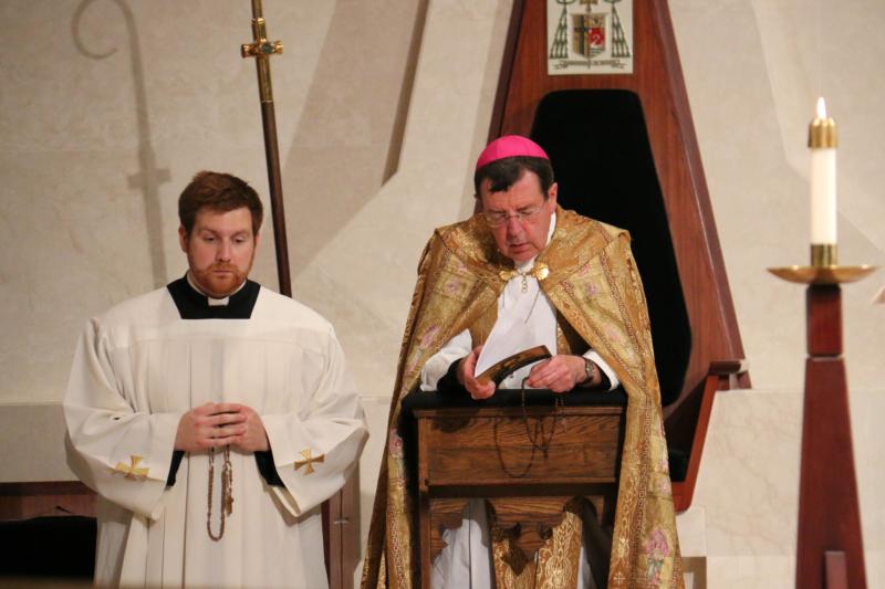 Detroit Archbishop Allen H. Vigneron and Father Stephen Pullis kneel to pray the rosary during a special prayer service in late November for Christians in the Middle East at the Cathedral of the Most Blessed Sacrament. (CNS photo/Jonathan Francis, Archdiocese of Detroit)