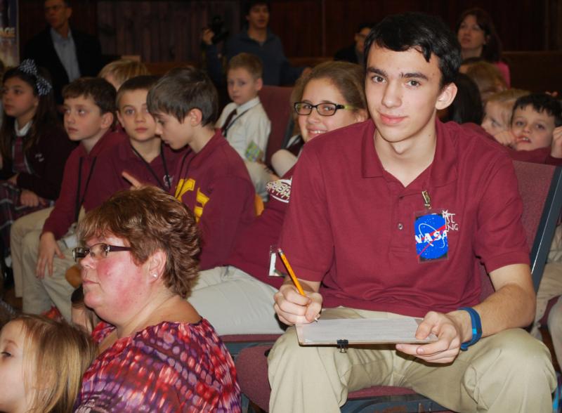 Christ the King School eighth-grader Michael Blais, of Rutland, Vt., records information from the International Space Station during the Feb. 4 assembly. (CNS photo/Cori Fugere Urban, Vermont Catholic)