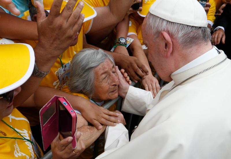Pope Francis greets a blind woman who is 99 years old along the parade route in Trujillo, Peru, Jan. 20. At the end of their plenary meeting March 6-9 at the Vatican, members of the Pontifical Commission for Latin America proposed that the church hold a Synod of Bishops “on the theme of the woman in the life and mission of the church.” (CNS photo/Paul Haring)