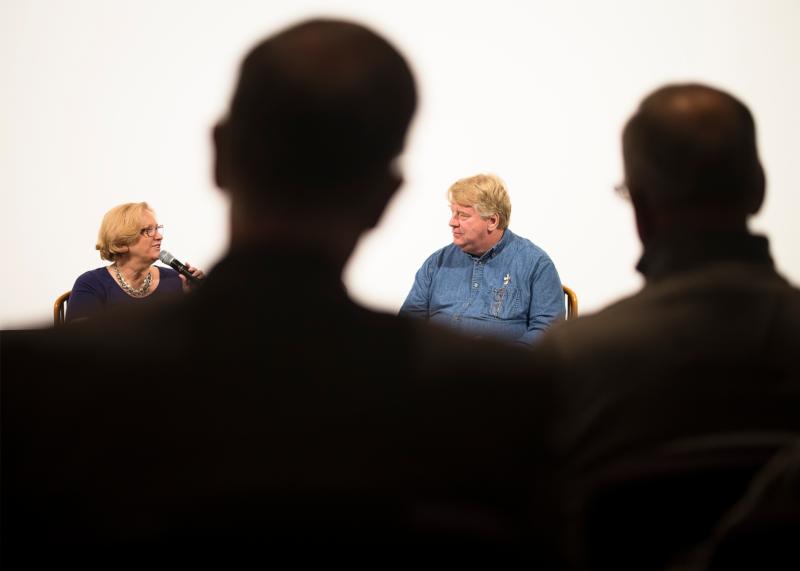 Kate Grosmaire and Deacon Andy Grosmaire of Tallahassee, Fla., discuss approaches to criminal justice that promote human dignity Nov. 5 at the St. John Paul II National Shrine in Washington. In 2010, their 19-year-old daughter, Ann, was shot and killed by her boyfriend. Called by their Catholic faith, both Kate and Deacon Grosmaire forgave their daughter’s killer. (CNS photo/Tyler Orsburn)