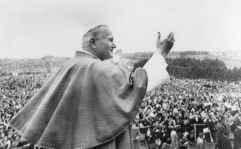 Pope John Paul II blesses the crowd in 1979 at the shrine of Our Lady of Knock in Ireland. Pope Francis will visit Dublin and Knock, Ireland, Aug. 25-26, mainly for the World Meeting of Families. But he also will meet Irish government leaders and is expected to meet with survivors of sexual abuse. (CNS file photo)