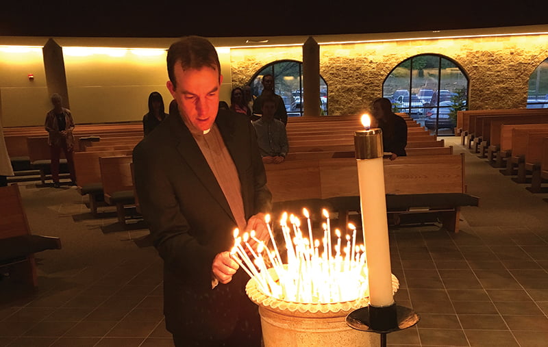 Deacon John Weist adjusts the candles at the healing service April 12 at Good Shepherd Parish, Shawnee. The healing service, which was for those who have been affected by any sort of harm or abuse, was the first of its kind in the archdiocese. Two more are scheduled. Leaven photo by Joe Bollig