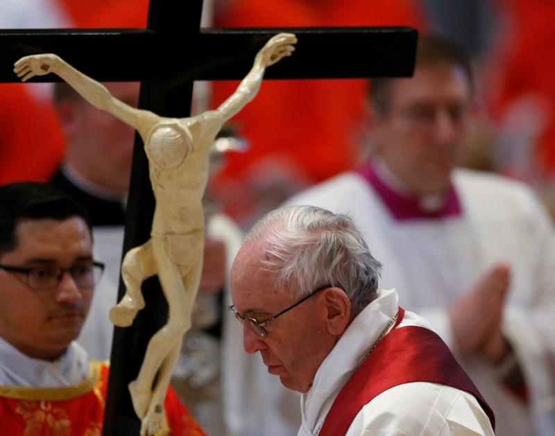 Pope Francis venerates the crucifix as he leads the Good Friday service in St. Peter’s Basilica at the Vatican in this April 14, 2017, file photo. The pope has been meditating on the wounds of Christ this Lent. (CNS photo/Paul Haring).