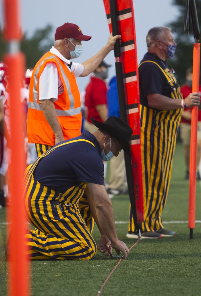 He said he goes early on Friday nights to make sure the equipment — which includes two posts holding the chain to measure the 10 yards needed for first downs; the “box,” which is the down marker post; and a “clip,” which is clipped on the chain indicating the alignment of the closest five-yard line between the two rods.