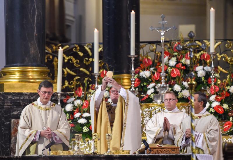Cardinal Rainer Maria Woelki of Cologne, Germany, and Cardinal Reinhard Marx of Munich elevate the Eucharist during Mass in the cathedral in Fulda, Germany, Sept. 23, 2014. Six German bishops will meet May 3 with Vatican officials to discuss German plans to allow greater access to the Eucharist for Protestants married to Catholics. (CNS photo/Jorg Loeffke, KNA)