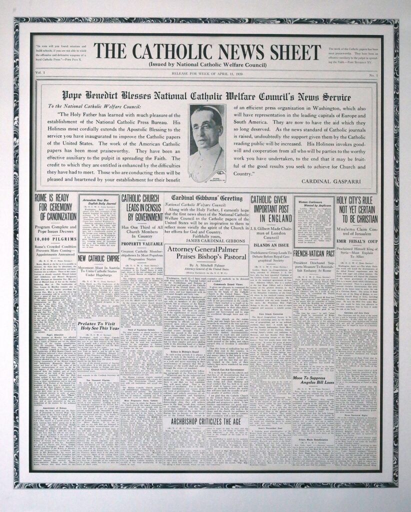 The first edition of the weekly NCWC News Service was dated April 11, 1920. It included greetings and well-wishes from Pope Benedict XV as well as stories on upcoming canonizations in Rome (Joan of Arc was elevated to sainthood only a month later, on May 16), a U.S. Census Bureau report indicating that American Catholics had grown to a third of the U.S. population, and the renewal of diplomatic relations between France and the Vatican.