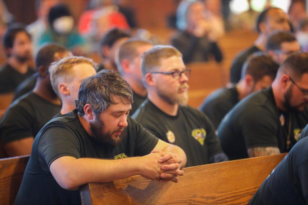 The cardinal solemnly walked past and incensed 20 similar hard hats placed in chairs in a semicircle in front of the sanctuary, with a red rose placed beside each one.