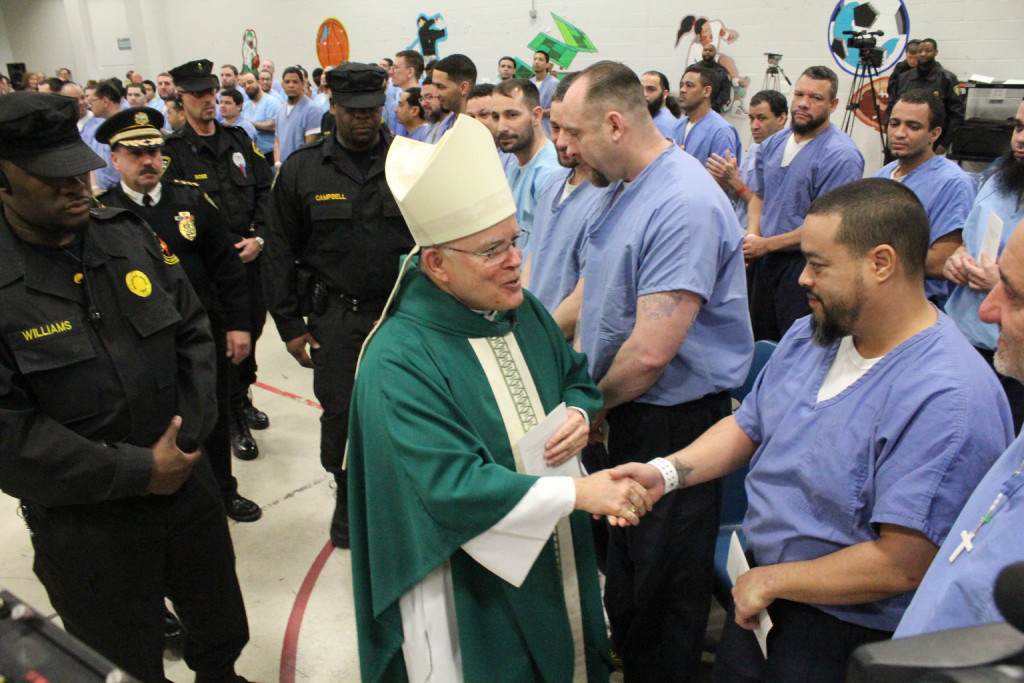 Archbishop Charles J. Chaput of Philadelphia greets inmates of Curran-Fromhold correctional facility in Philadelphia during a visit in mid-January. Pope Francis has a planned visit to the prison Sept. 27 during his two- day visit to the city. (CNS photo/Sarah Webb, CatholicPhilly.com)