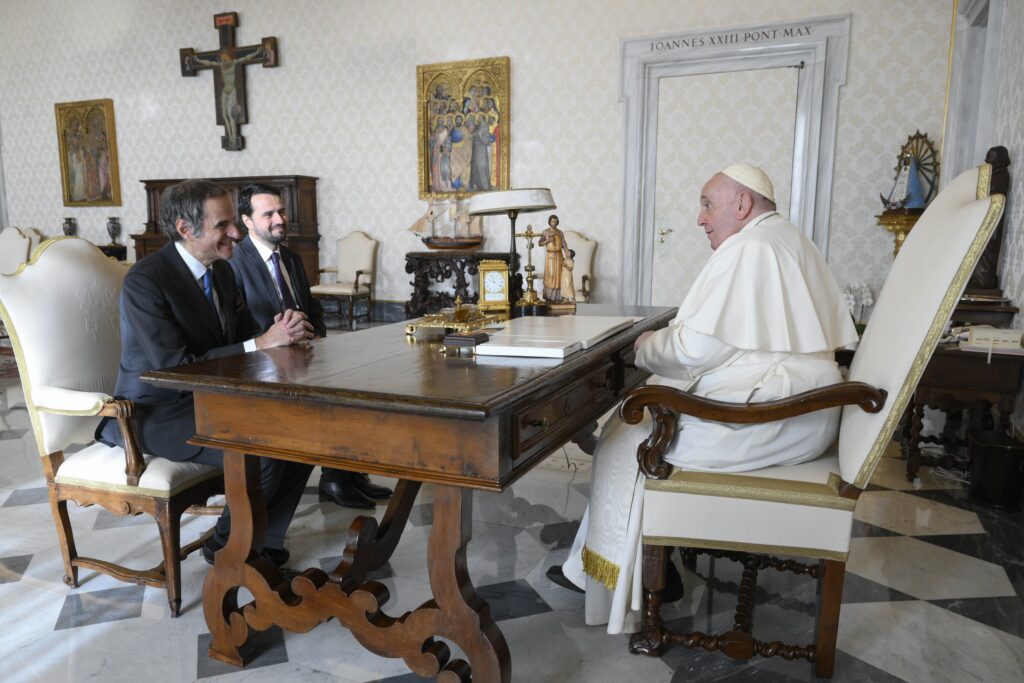 Grossi noted that while both the IAEA and the pope have made clear the risks of producing more nuclear weapons, the “exclusively peaceful use of nuclear power is important,” especially as humanity faces another crisis beyond nuclear war: climate change.