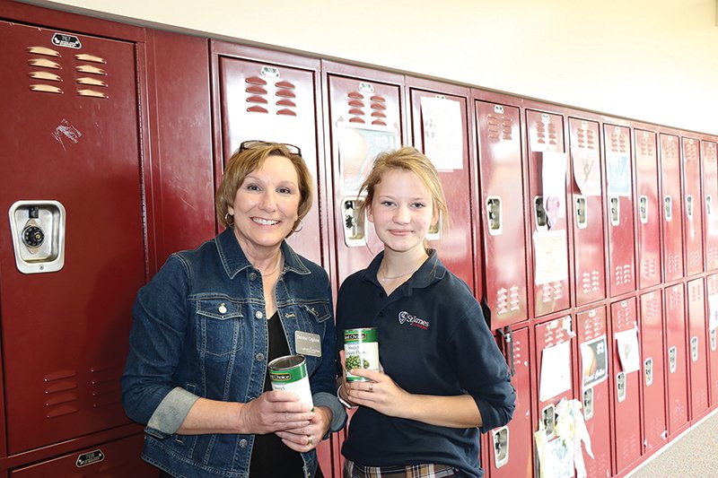 Denise Ogilvie, right, Catholic Charities director of outreach, meets with a St. James sophomore at a canned food drive at St. James Academy in Lenexa.