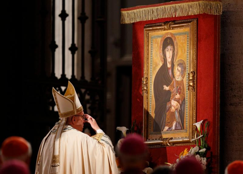 Pope Francis venerates a Marian image outside the Basilica of St. Mary Major in Rome in this May 26, 2016, file photo. The pope has instituted a new Marian feast honoring Mary as mother of the church. It will be celebrated every year on the Monday after Pentecost. (CNS photo/Paul Haring)