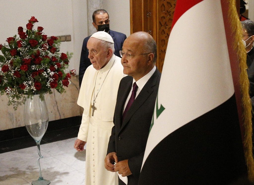 The appointment with civic and cultural leaders at the presidential palace in Baghdad came shortly after the pope landed in Iraq for his first foreign trip in 15 months because of the COVID-19 pandemic.