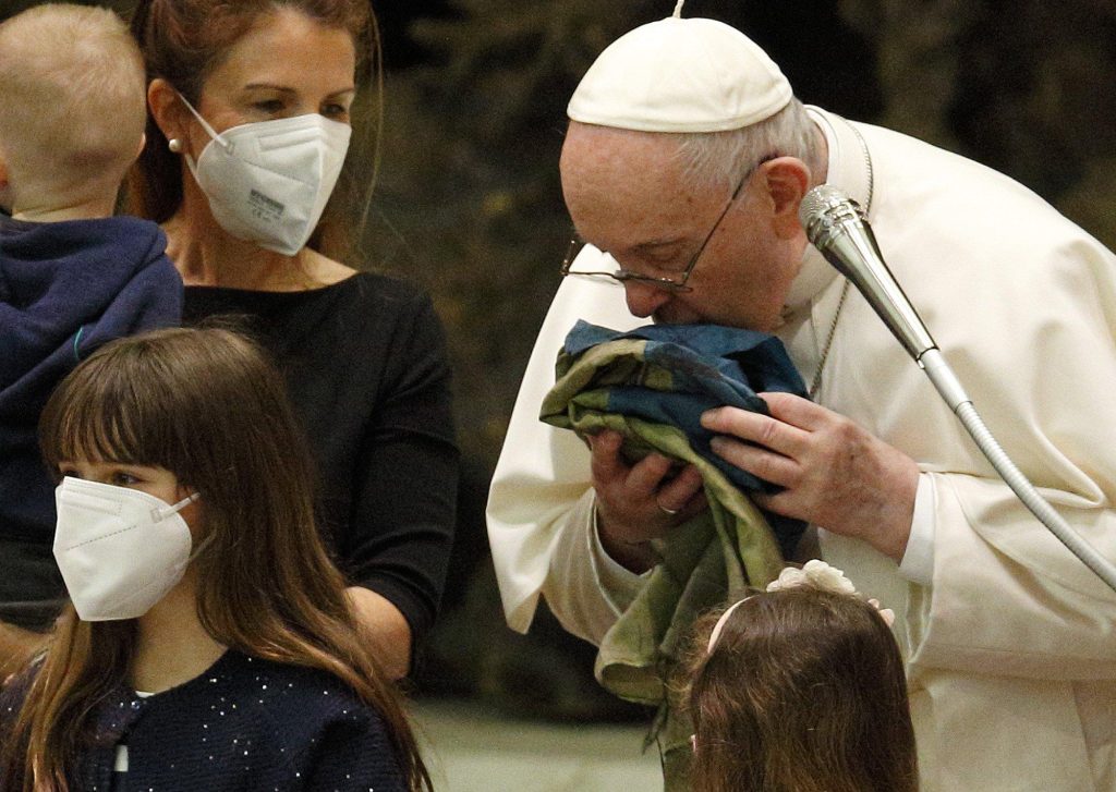 After leading pilgrims in a silent prayer for the country, Pope Francis held up a Ukrainian flag that was sent to him “from that tormented city of Bucha.”
