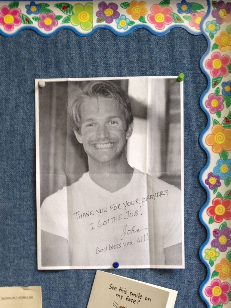 After he accepted the job offer, John wrote the note on his picture and sent it to St. Paul School. Months later, I saw it on the bulletin board.
