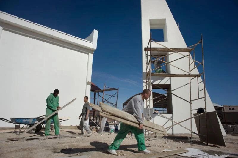 Inmates at the Chihuahua state prison in Ciudad Juarez, Mexico, work on remodeling the chapel in the men’s section of the prison Jan. 28. The chapel is being remodeled for a visit by Pope Francis, scheduled for Feb.17. (CNS photo/David Maung)