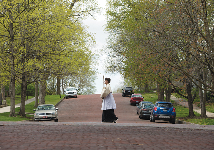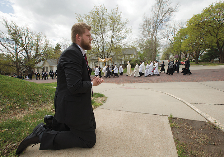 ATCHISON — Fourth Street homeowners knelt on their front porches as a procession of clergy, altar servers, and parishioners passed by. They knelt not for any of these groups, but for the eucharistic Lord, carried in a monstrance at the head of the crowd.