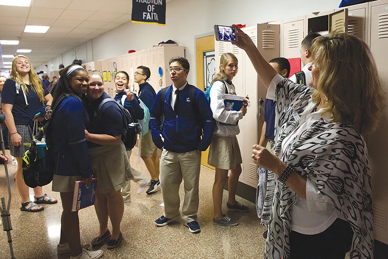 Sheri Cafer strolls down the hallways of Hayden Catholic High School in Topeka, taking photos as she goes. Cafer shares photos like the one above on the school’s Facebook page as a way to engage students and give the Topeka community a glimpse into life at Hayden. LEAVEN PHOTO BY JOE MCSORLEY