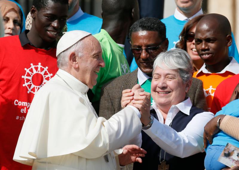 Pope Francis greets Sister Norma Pimentel, executive director of Catholic Charities of the Rio Grande Valley in Texas, during his general audience in 2017 in St. Peter’s Square at the Vatican. Sister Pimentel, a member of the Missionaries of Jesus, and a longtime advocate for immigrants and refugees, will receive the University of Notre Dame’s 2018 Laetare Medal at the school’s graduation ceremony May 20.(CNS photo/Paul Haring)