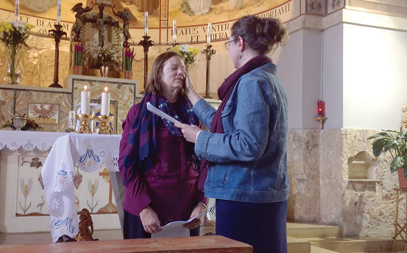 Sharri Orndorff, left, takes part in the Rite of Acceptance during a pilgrimage to the Church of the Visitation at Ein Kerem, Israel. Denise Bossert, a Catholic author who became Orndorff’s mentor, was her sponsor for the event. Orndorff was inspired to become Catholic after seeing a quote pinned by Bossert on the social media site Pinterest.
