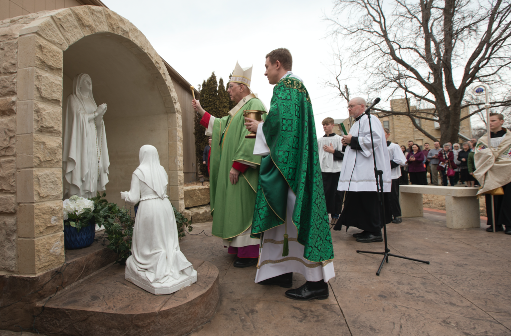 When Archbishop Joseph F. Naumann blessed the chapel and Our Lady of Lourdes grotto outside Immaculate Conception Parish on Jan. 15, he was joined at Mass by pastor Father Justin Hamilton, who concelebrated, and Deacon Jody Madden from Atchison, who assisted.