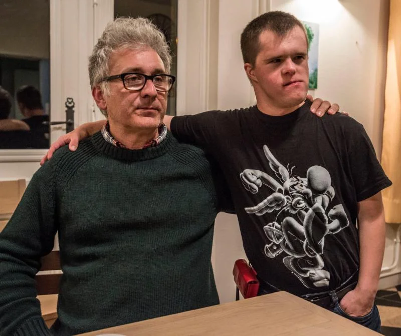 Randall Wright, who directed the documentary “Summer in the Forest” about the L’Arche communities founded by Canadian Jean Vanier, poses with David, a resident who has Down syndrome. L’Arche, French for “The Ark,” brings together people with intellectual or physical disabilities into an intentional-living situation with able-bodied people who share life with them and treat them as equals. (CNS photo/Abramorama)