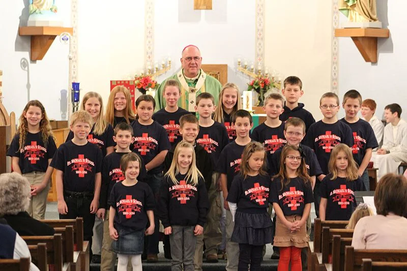 Archbishop Joseph F. Naumann kicked off Catholic Schools Week by celebrating the 125th anniversary of St. Michael School in Axtell. Above, the archbishop stands with the school’s student body.