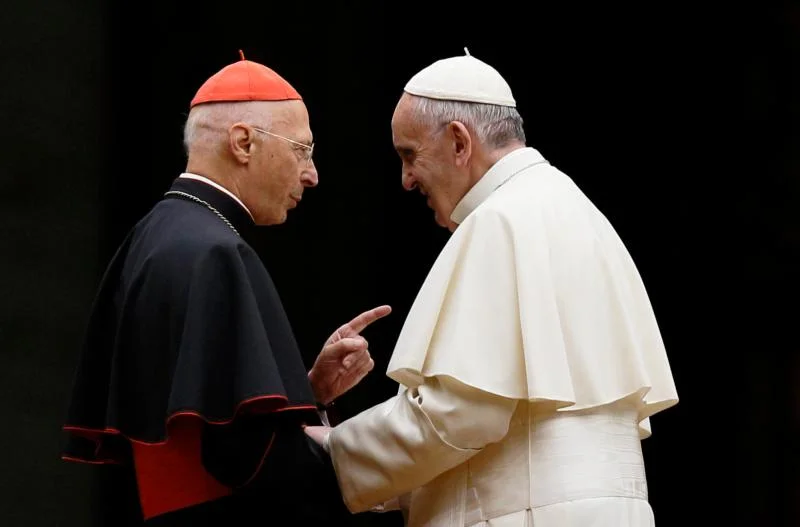 Cardinal Angelo Bagnasco, president of the Italian bishops’ conference, talks with Pope Francis during a prayer vigil for the Synod of Bishops on the family in St. Peter’s Square at the Vatican in this Oct. 3, 2015, file photo. Cardinal Bagnasco said Italy’s bishops are united in reaffirming the rights of children to be raised by a mother and father. His comment came as the Italian Senate is set to vote Jan. 28 on legislation that would allow civil unions for heterosexual and homosexual couples. (CNS photo/Paul Haring)