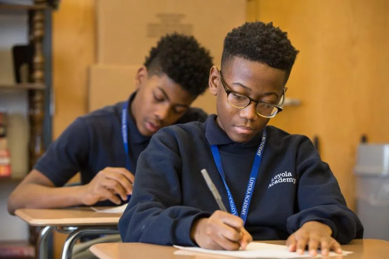 Camren Hamilton writes and essay during English class Feb. 10 at the Jesuit-run Loyola Academy of St. Louis middle school. The Nativity School concept was pioneered by Jesuits in American inner cities beginning in the early 1970s. (CNS photo/Lisa Johnston, St. Louis Review)