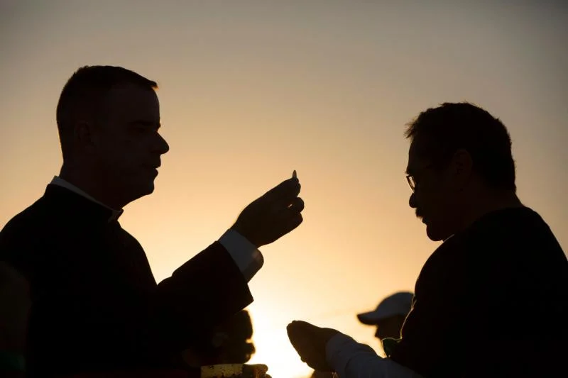 Several U.S. prelates — including Cardinal Roger M. Mahony, retired archbishop of Los Angeles; Archbishop Joseph E. Kurtz of Louisville, Kentucky, president of the U.S. Conference of Catholic Bishops; Archbishop John C. Wester of Santa Fe, New Mexico; Bishop Gerald R. Barnes of San Bernardino, California; and Auxiliary Bishop Eusebio L. Elizondo of Seattle, chairman of the bishops’ migration committee — distributed Communion to the people gathered on the levee. Msgr. J. Brian Bransfield, USCCB general secretary, also distributed Communion.