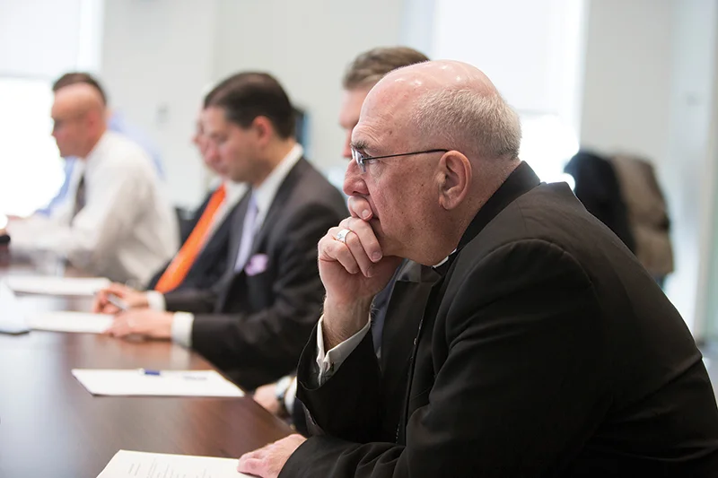 Archbishop Joseph F. Naumann meets with a group of 30 people at the Polsinelli law firm to found the Catholic Bar Association. Photo by Doug Hesse.