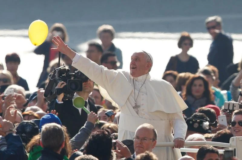 Pope Francis reaches for a balloon released by someone in the crowd during his general audience in St. Peter’s Square at the Vatican March 30. The power of God’s forgiveness “is greater than our sins,” the pope said in his audience talk. (CNS photo/Paul Haring)