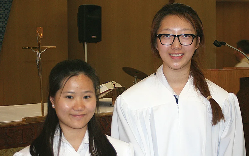 Before Xuemeng “Rona” Chen and Lingfei “Bonnie” Kong came to Maur Hill-Mount Academy and were baptized, they had little to no religious background in their homeland in China.