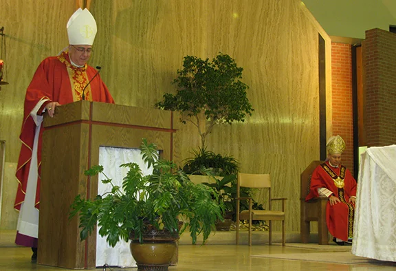 LEAVEN PHOTO BY SHEILA MYERS Archbishop Joseph F. Naumann delivers the homily at the annual Red Mass Oct. 10 at Curé of Ars in Leawood, celebrated by Bishop Robert Finn (right) of the Diocese of Kansas City-St. Joseph, Mo., and sponsored by the Catholic Lawyers Guild of Kansas City.
