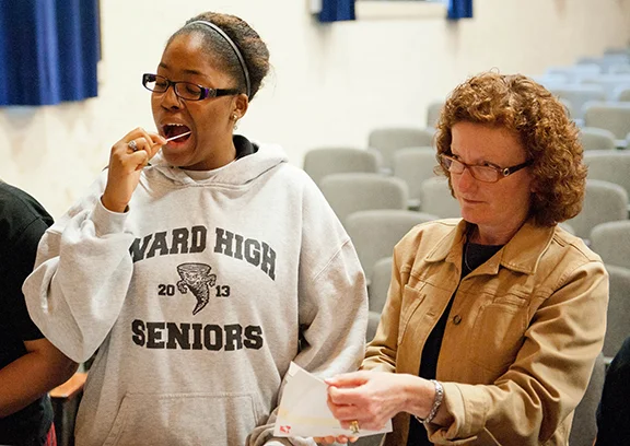 Elexis Whitmore, left, a senior at Bishop Ward High School in Kansas City, Kan., swabs the inside of her mouth as part of the national bone marrow donor registry process. Mary Spangler, right, with Ward’s development office, assists during this inaugural “18 and Swabbin’” drive, which was held at the high school on April 10.