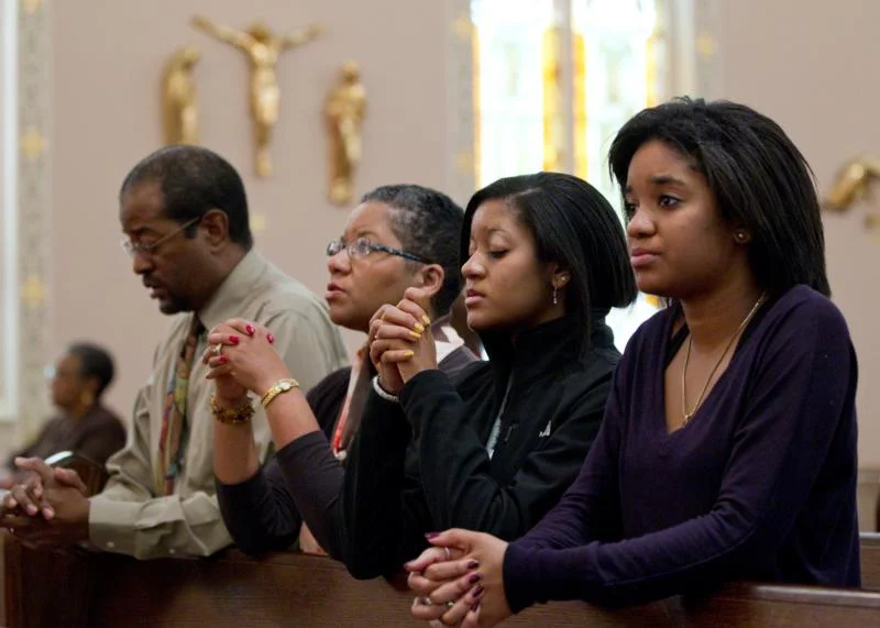 An African-American family prays after arriving for Mass in 2011 at St. Joseph’s Catholic Church in Alexandria, Va. For the 29th year in a row, people of all faiths are urged to observe a national day of prayer for the African-American family Feb. 5 as part of Black History Month, observed every February. (CNS photo/Nancy Phelan Wiechec)