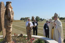 Archbishop Joseph F. Naumann blesses the new Guardian Angel Shrine in the infant burial section of Gate of Heaven Cemetery Oct. 3. By Therese Horvat.
