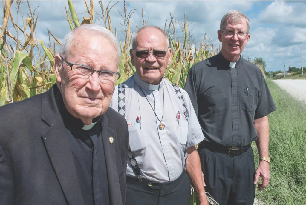 From left, Fathers Carl Dekat, Earl Dekat and Mike Peterson serve the rural communities of Alma, Wamego, Flush and Paxico. The retired Dekat cousins help Father Peterson keep up with his four parishes. LEAVEN PHOTO BY JOE BOLLIG
