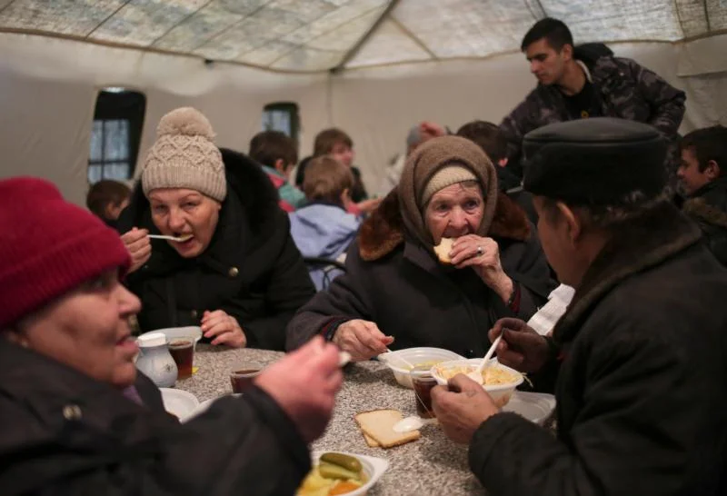 People displaced by fighting eat lunch inside a heated tent at a train station during evacuations in 2015 in the Ukrainian city of Slaviansk. The Catholic bishop responsible for eastern Ukraine has backed calls for the deployment of international peacekeepers and praised “pressure from below” to end the four-year war. (CNS photo/Anastasia Vlasova, EPA)
