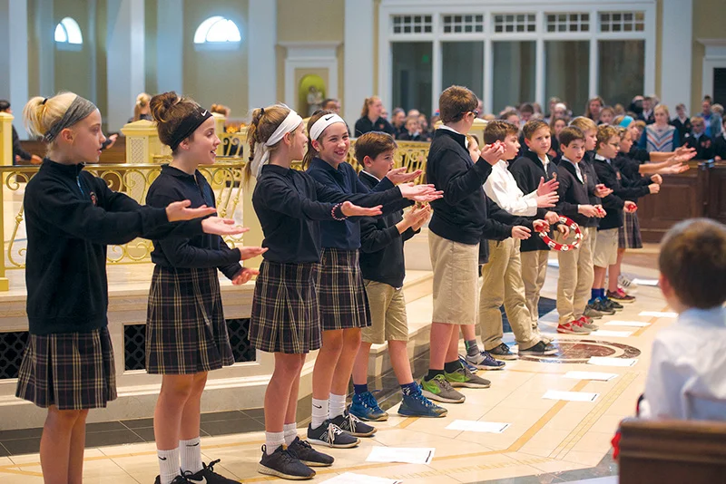 Shannon Kremer’s fifth-grade class at St. Michael the Archangel School in Leawood sings in front of the school during Kindness Week on Nov. 17. The all-school sing-along was part of a week filled with activities that taught students practical ways to be kind. LEAVEN PHOTO BY JOE MCSORLEY
