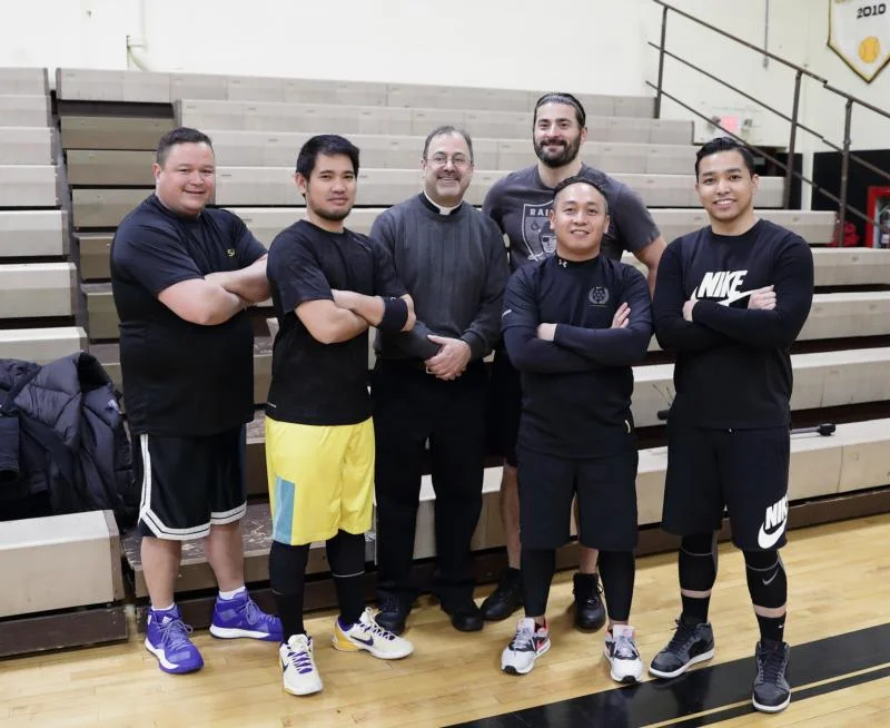 “Most people don’t really know what a priest does during the week besides writing a homily,” said Father Wallack, who was joined on the court by Father John Michael Patilla, parochial vicar of St. Benedict Parish, in Holmdel and chaplain in St. John Vianney High School; Father Augusto Gamalo, parochial vicar of St. Gregory the Great Parish in Hamilton Square; Father Thomas Vala and Father Gregg Abadilla, pastor and parochial vicar, respectively, of St. Clement Parish in Matawan; and Father Dean Gaudio, pastor of St. Elizabeth of Hungary Parish in Avon-by-the-Sea.
