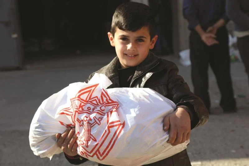 An Iraqi boy is glad to receive food provided by the Knights of Columbus. The Catholic fraternal organization has raised and committed almost $19 million in aid to Christians and other persecuted religious minorities in the Middle East. (CNS photo/courtesy Knights of Columbus)
